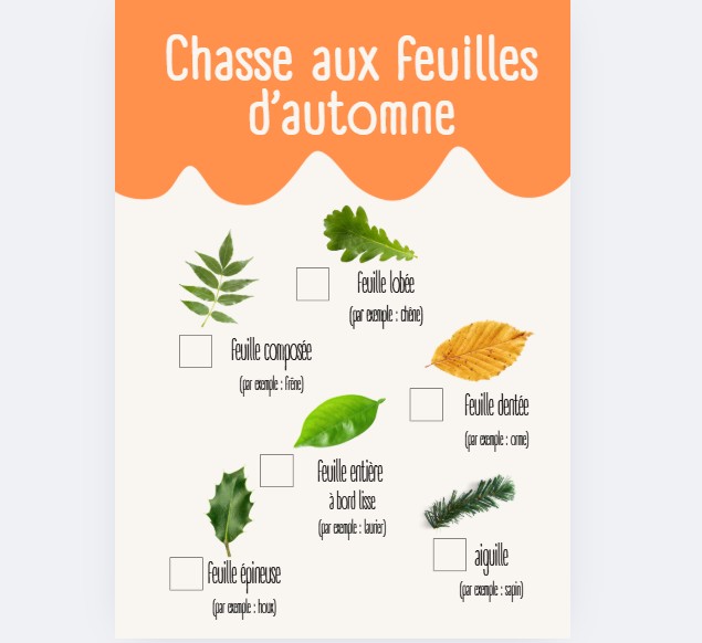 Seul ou par petits groupes, les élèves sont invités à partir à la chasse aux feuilles d'automne à l'aide de ce document. L'occasion pour les élèves de percevoir les différences entre les différents types de feuilles, d'aiguiser leur regard sur la nature et d'utiliser d'autres sens, notamment le toucher, pour mieux connaitre le monde végétal qui nous entoure. Les plus grands pourront aussi apprendre à nommer les différents types de feuilles grâce à cette activité.