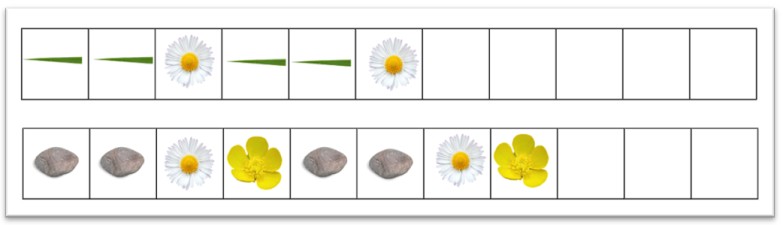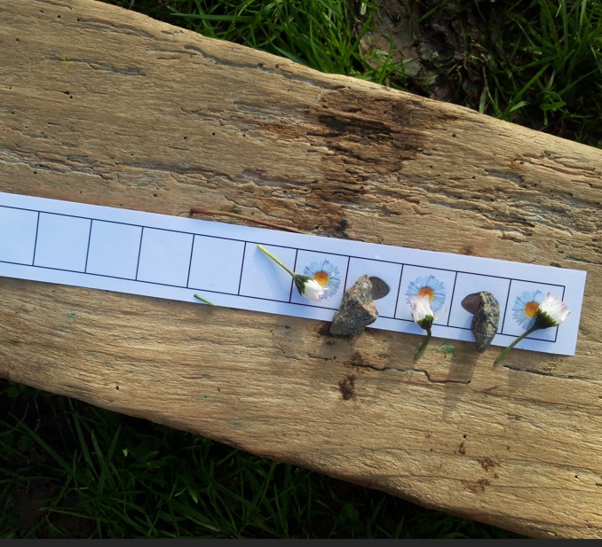 Les éléments naturels se prêtent volontiers à la réalisation d'algorithmes et autres suites organisées. On peut laisser les élèves créer eux-mêmes leurs propres algotithmes. On peut aussi leur donner un modèle à reproduire et/ou à compléter. Les élèves peuvent reproduire et compléter un algotithme que vous aurez vous-mêmes installer directement avec les matériaux trouvés sur place. Vous pouvez aussi leur fournir ces petites bandes qui proprosent des algorithmes plus ou moins complexes. Elles sont à télécharger ici.