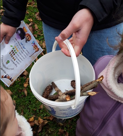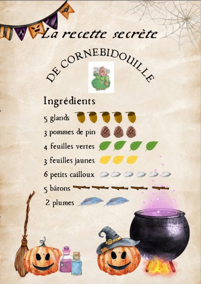 Les élèves se transforment en petits sorciers et sorcières et doivent réaliser une potion magique à partir d’ingrédients naturels récoltés dans leur environnement : cailloux, feuilles, pommes de pin, glands…