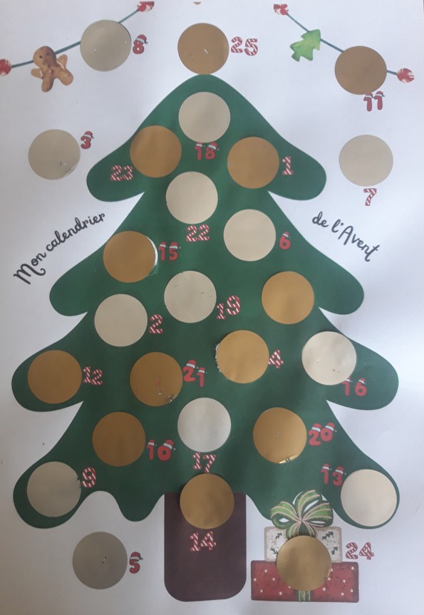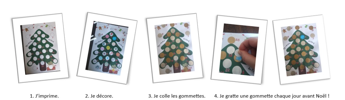 Il suffit d'imprimer la fiche vierge et de compléter chaque disque blanc par un petit mot, un dessin... Recouvrez ensuite chaque zone par une gommette à gratter de 25 mm de diamètre et le tour est joué : une surprise à découvrir chaque jour en grattant la gommette et un joli sapin décoré à afficher le jour de Noël !