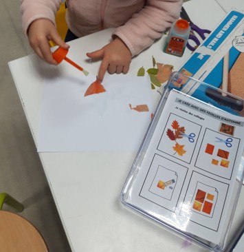 Chaque plateau contient des feuilles blanches (ou noires) format A5, une notice de réalisation et le matériel nécessaire à chaque activité (colle, ciseaux, craies grasses, ...). Une boite avec diverses feuilles d'automne est mise à disposition à côté des plateaux.