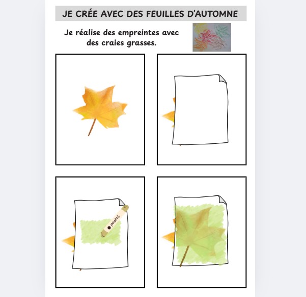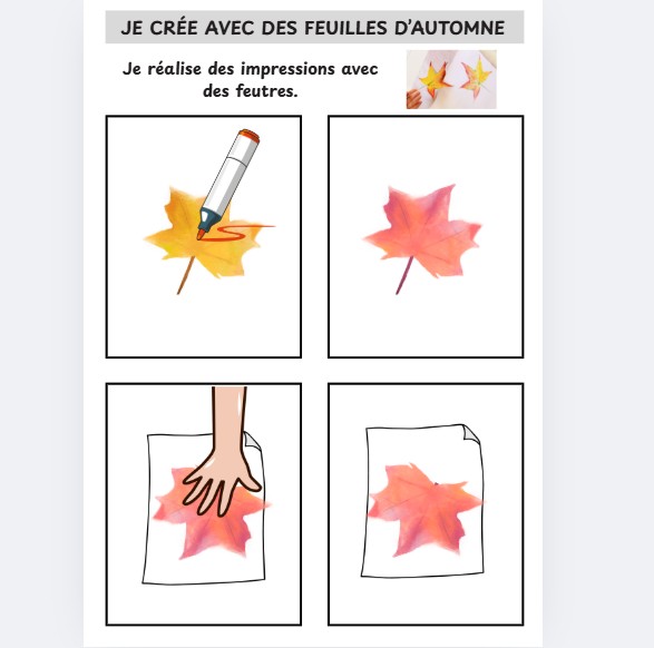 Le principe est d'utiliser des feuilles d'automne comme éléments de création artistique tout en découvrant différentes techniques (impression, découpage, collage, ...).